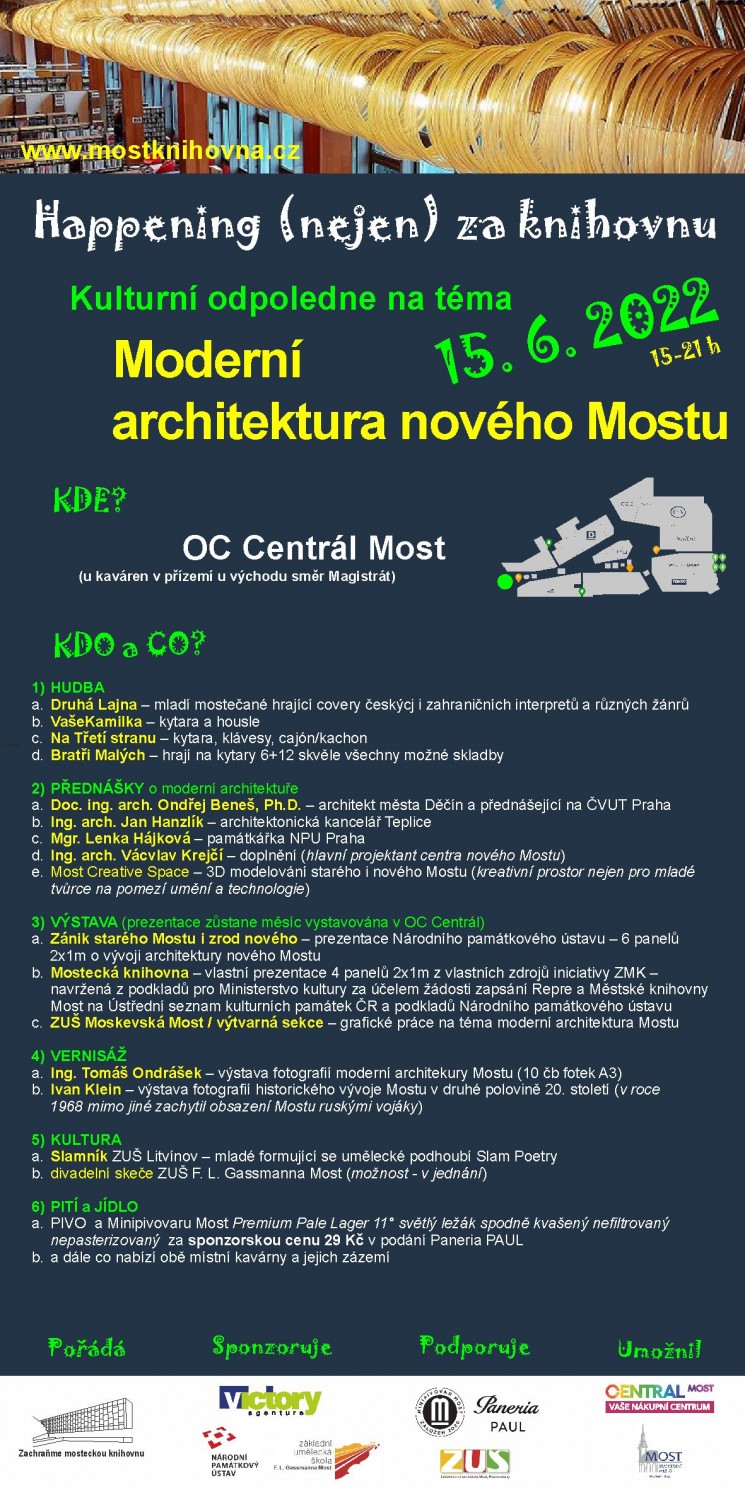 Budete vřele očekáváni na kulturní akci 15.6. v Centrálu mezi 15 až 21 hodinou s názvem Happening (nejen) za knihovnu aneb Kulturní odpoledne na téma: Moderní architektura nového Mostu. K pohodovému nejen přednáškovému odpoledni bude kulturní doprovodný program, a to: živá hudba – slam poetry – divadlo - výstava - vernisáž.