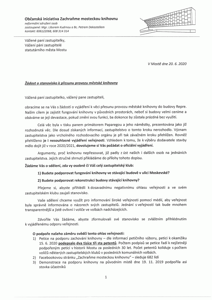 Zaslali jsme otevřený dopis všem zastupetlům města Mostu k zaujetí stanoviska ke zrušení knihovny ve stávajících prostorách.
